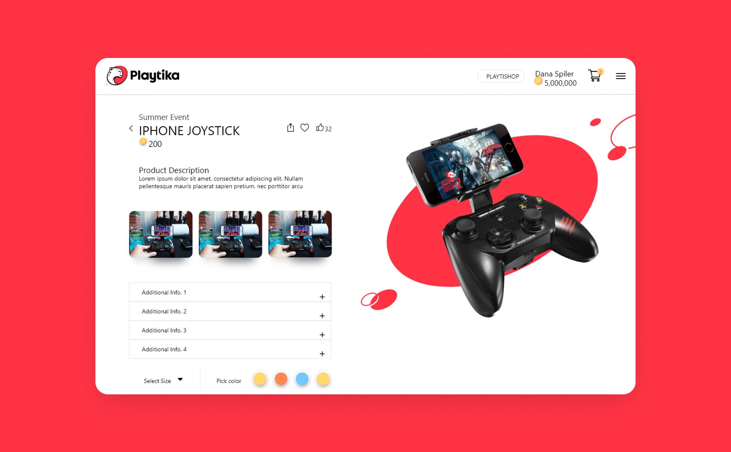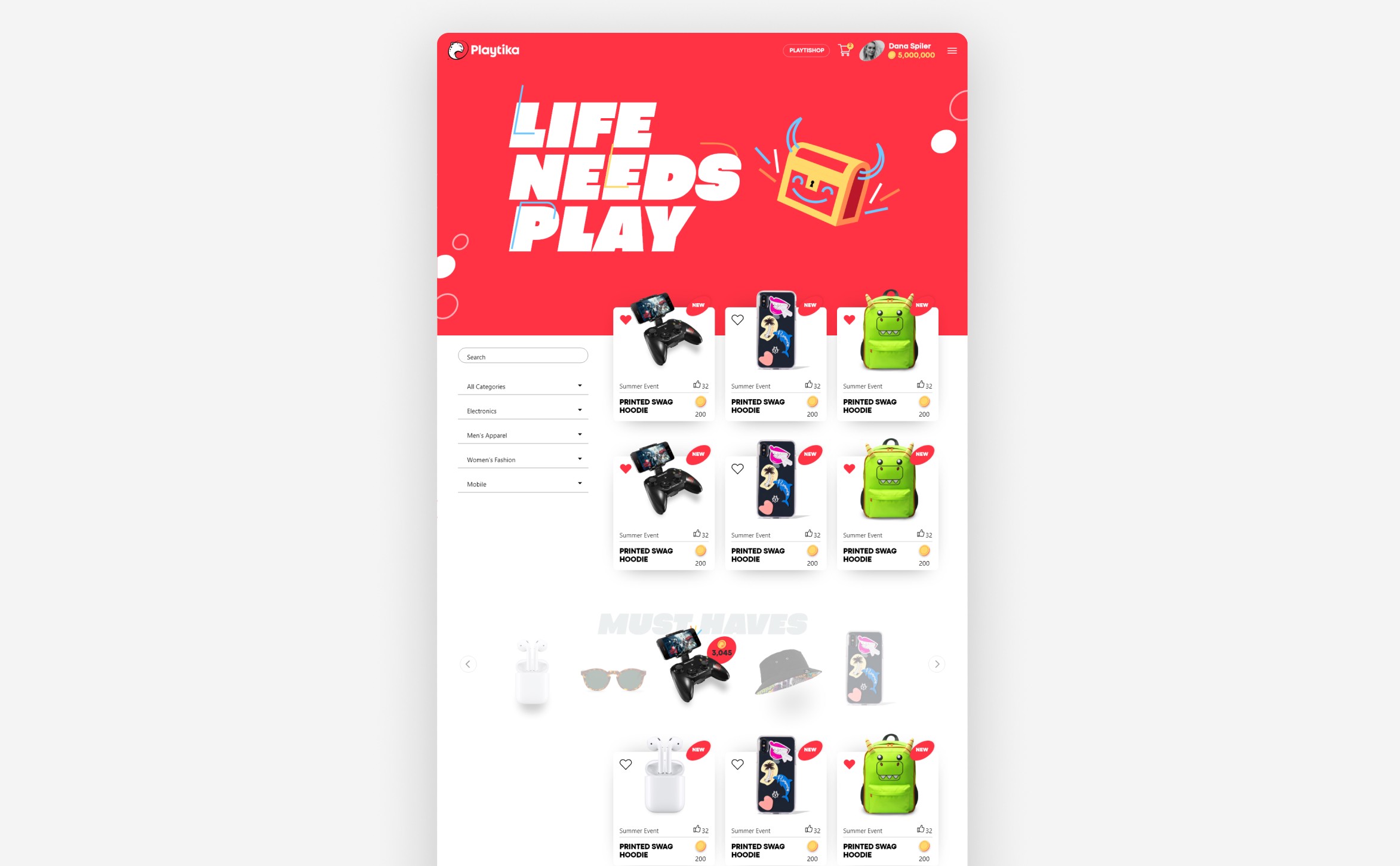 Playtika is a leading developer of mobile games with a vibrant internal culture. I was tasked with designing an internal web platform modeled as a virtual store, where employees could redeem Playticoins (the company’s internal reward currency) for gadgets, experiences, and branded items. This portal was part of a broader employer branding initiative aimed at increasing employee motivation, engagement, and recognition. The design had to be playful and interactive, while staying aligned with Playtika’s brand identity. The result was a gamified shopping experience that felt native to the culture of a gaming company.